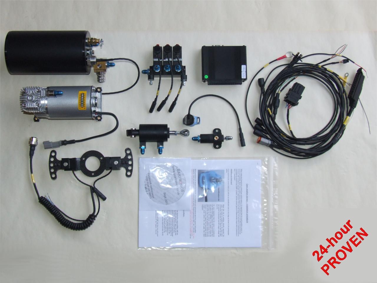 - System includes: 12v high-efficiency compressor, purpose designed accumulator, gearbox actuator, throttle blipper & valve assemblies as required, conventional twin paddle assembly or single 'rally' paddle, replacement gear position sensor (hall-effect) & fully programmable closed-loop GCU complete with our proprietary PC setup software, & comprehensive installation/setup instructions.