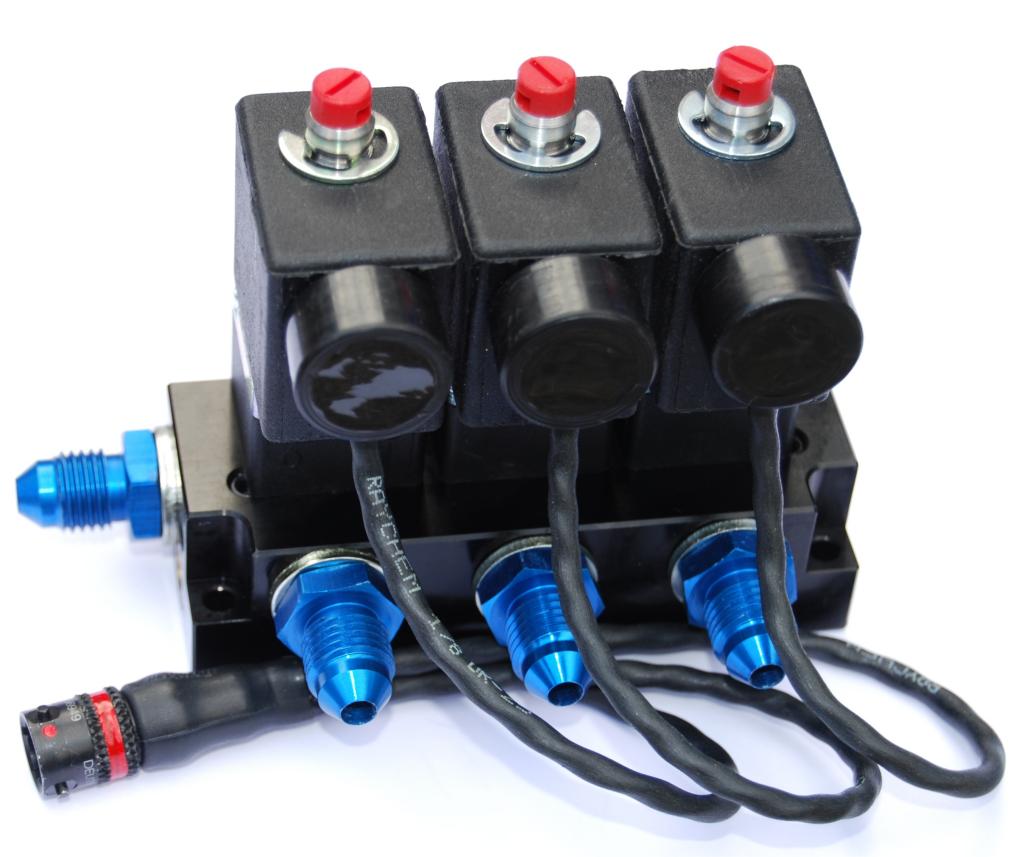 The Geartronics remote valve assembly uses direct operating 'poppet' valves for reduced susceptibility to dirt ingress. The valve performance allows 5 down-shifts in less than 1 second (depending upon engine response). Valve electrical connections are fully sealed and use Raychem Spec55 wire and DR25 sleeving for ultimate reliability. Weight: 480g. |
