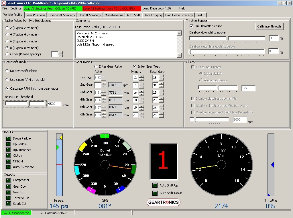The calibration software has an array of user definable parameters to ensure that the correct shift strategy is achieved for every installation. Note that this is not a timer based system, and unlike some other systems, you do not need to adjust numerous timer parameters for engine cut, actuator & blip durations! All events in the shift sequence are dynamically controlled in real-time to ensure fast, reliable and consistent shifts under all conditions. The GCU also features a detailed datalogging system that allows the race engineer to fine tune the system. |